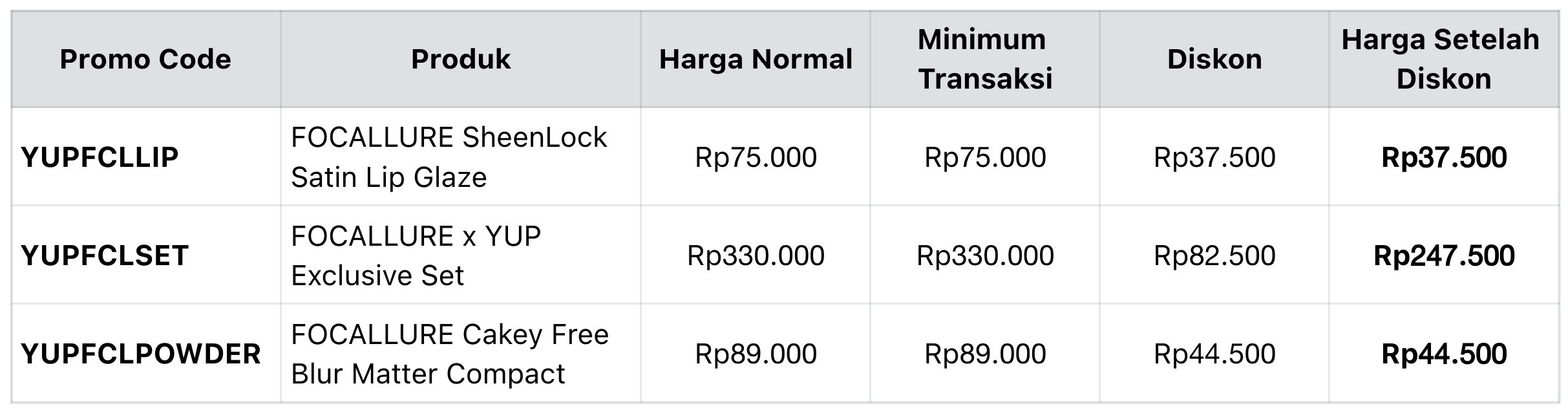 - Voucher dapat digunakan untuk transaksi QRIS di TikTok Shop untuk produk FOCALLURE x YUP Exclusive Set seharga Rp330.000